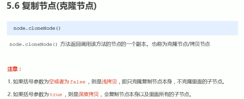 克隆节点:cloneNode内参数代表浅拷贝或者深拷贝。通常与父类添加节点并用。