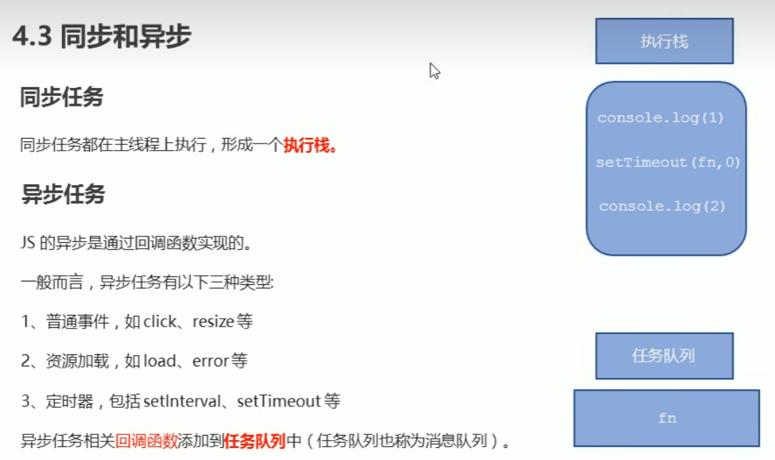 同步任务:同步任务都在主线程上执行,形成一个执行栈。