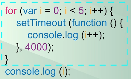 执行栈内为同步任务即for循环的i++和log函数,将for循环内部的异步任务setTimeout放入消息队列,由于for循环则进行了五次内部的log(i++)放入消息队列中。