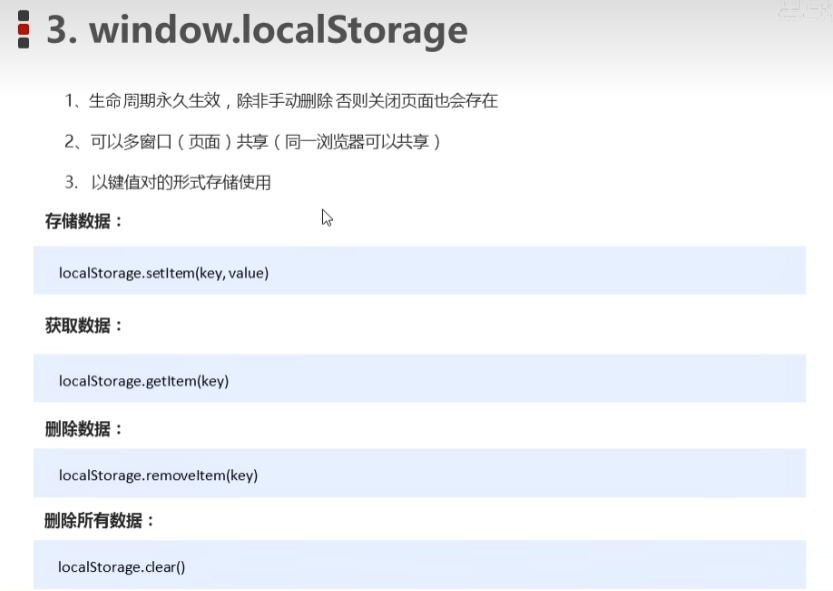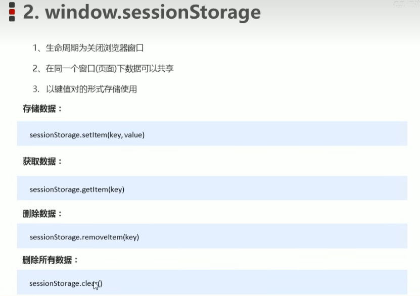 1.localStorage生命周期永久,除非手动删除否则一直存在。sessionStorage生命周期为浏览器页面,关闭页面则消失。