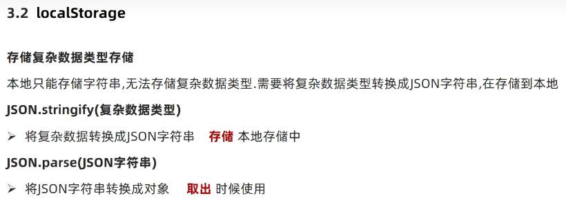 复杂类型存储:存入时利用JSON.stringify将复杂类型转换为JSON字符串存入,取出时利用JSON.parse将存储中的JSON字符串转换为对象取出。