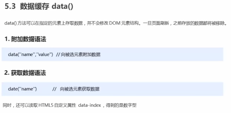 data和attr都可以获取H5属性例如data-index,区别在于data获取不需要加前缀data-,且data获取的值是Number类型。