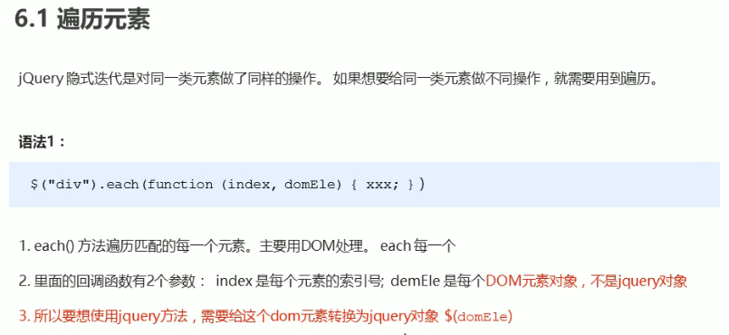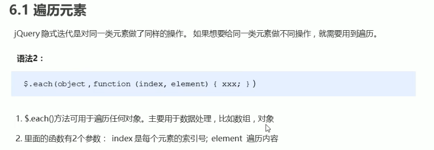 遍历元素:each中回调函数的参数是下标和dom元素,获取到的dom元素需转化为jQuery对象才可以使用jQuery方法。