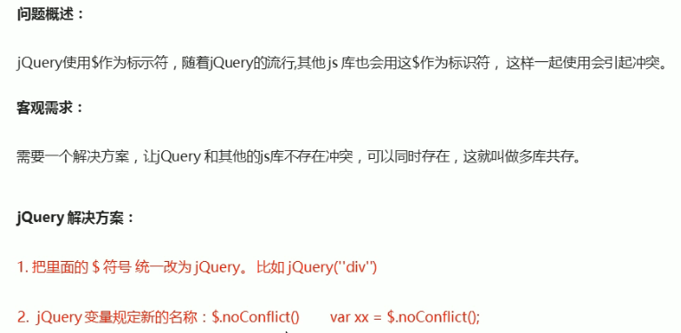 jQuery多库共存:① 使用jQuery代替$、② 利用$.noConfflict()设置新顶级对象