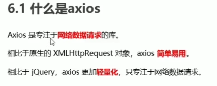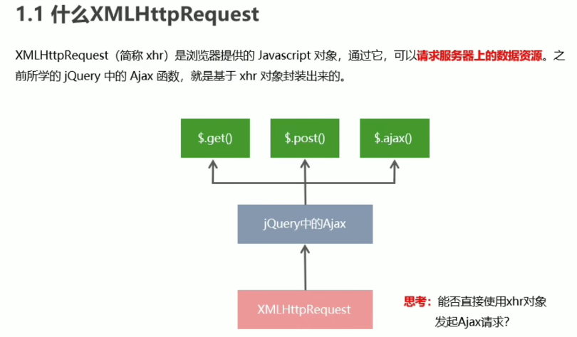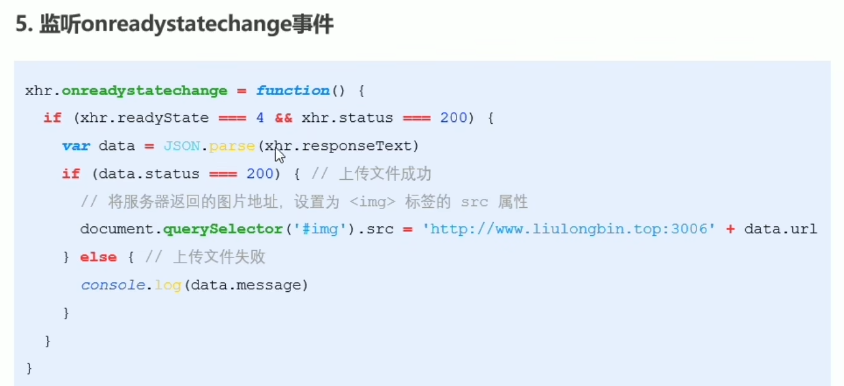 // 创建xhr对象 let xhr = new XMLHttpRequest(); // 调用open函数 xhr.open('GET', 'http://www.liulongbin.top:3006/api/getbooks'); // 调用send函数 xhr.send(); // 监听onreadystatechange事件 xhr.onreadystatechange = function() { if(xhr.readyState === 4 && xhr.status === 200) { // 获取服务器响应数据 console.log(xhr.responseText); } }