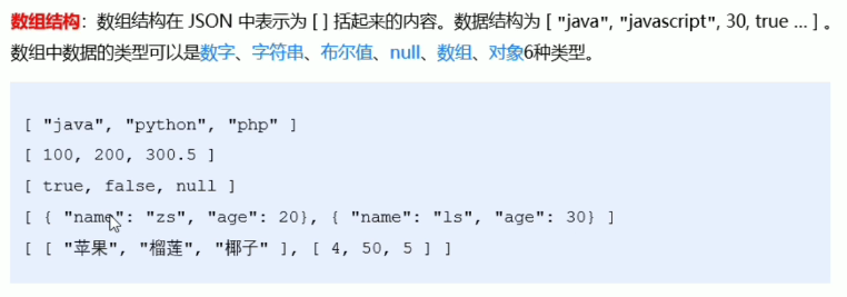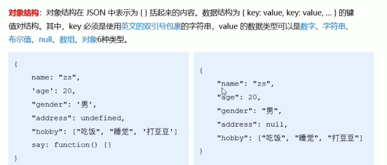对象结构:{key:value},key必须是以双引号包裹的字符串。