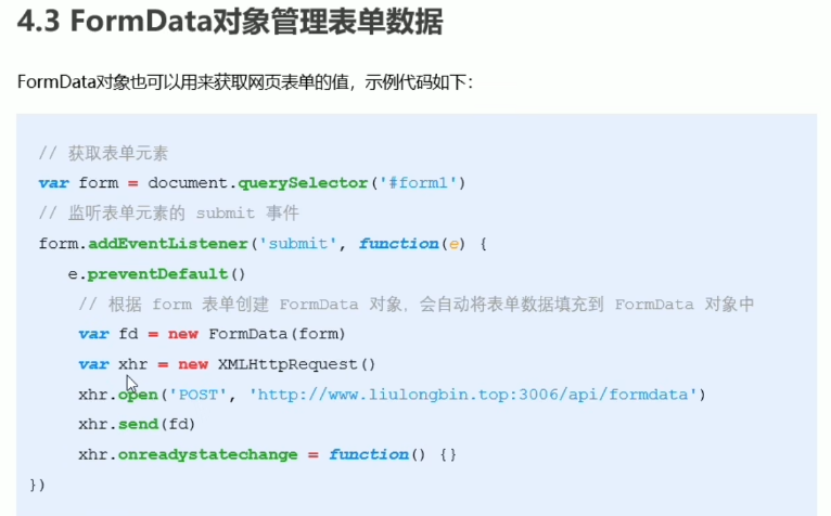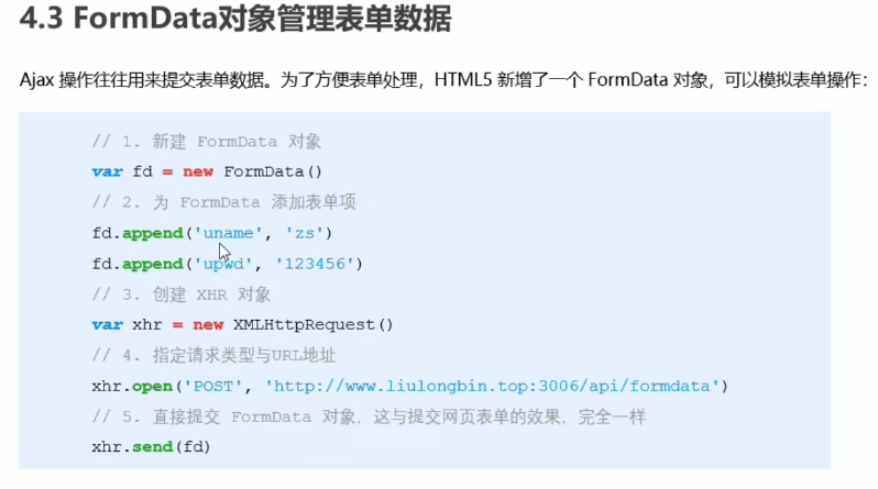 // 创建xhr对象 let xhr = new XMLHttpRequest(); // 调用open函数 xhr.open('POST', 'http://www.liulongbin.top:3006/api/addbook'); // 设置Content-Type属性 xhr.setRequestHeader('Content-Type', 'application/x-www-form-urlencoded'); // 调用send函数,指定发送数据 xhr.send('bookname=水浒传&author=施耐庵&publisher=上海图书出版社'); // 监听onreadystatechange事件 xhr.onreadystatechange = function() { if(xhr.readyState === 4 && xhr.status === 200) { console.log(xhr.responseText); } }