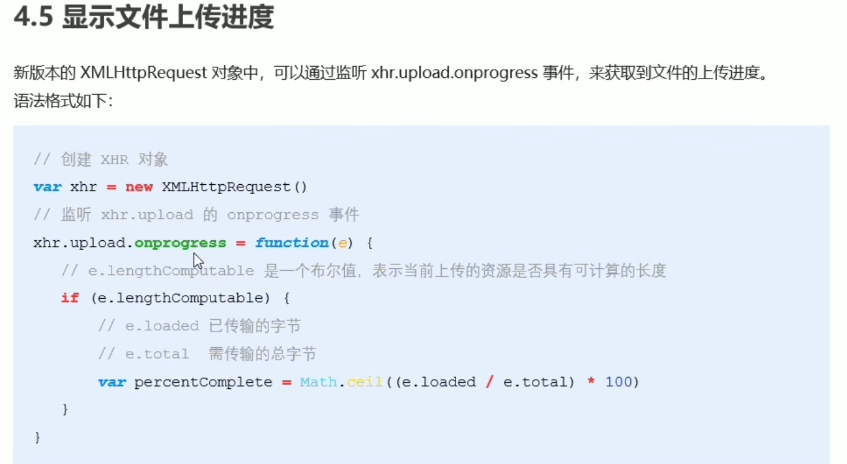 ④ 获取数据传输的进度信息:xhr.upload.onprogress事件