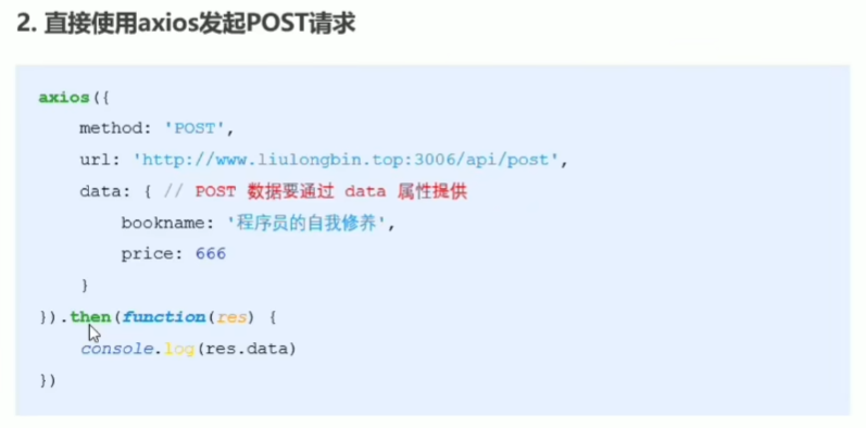 axios发起post请求:axios.post(url, {data}).then(callback)
