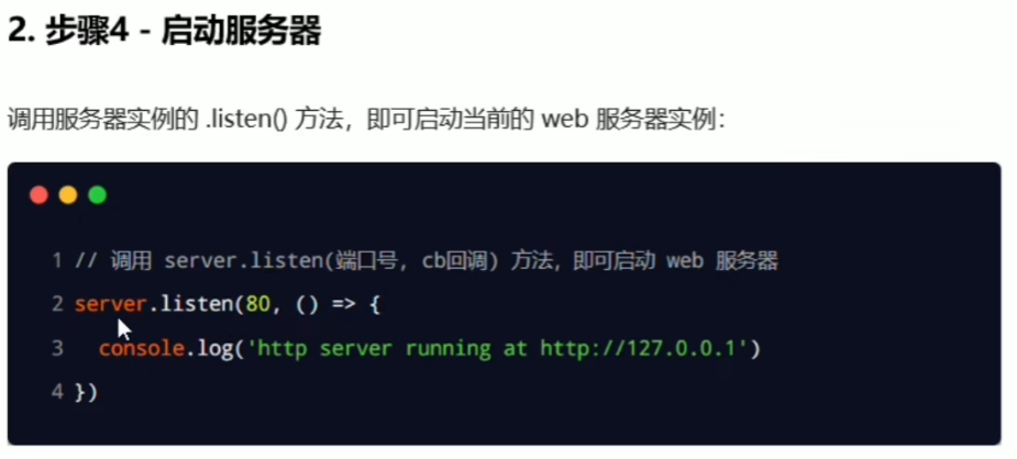 ④ 启动服务器:.listen方法,参数为端口号和回调函数。