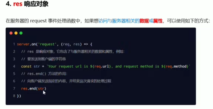 res响应对象:存储服务器相关的属性和数据。(通过end方法发送内容,响应给客户端)