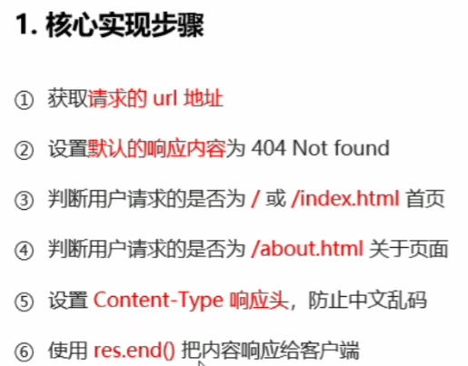① 获取请求的url地址 ② 设置默认响应内容为404 Not found ③ 判断用户请求 ④ 设置Content-Type响应头防止中文乱码 ⑤ 使用res.end将内容响应给客户端。