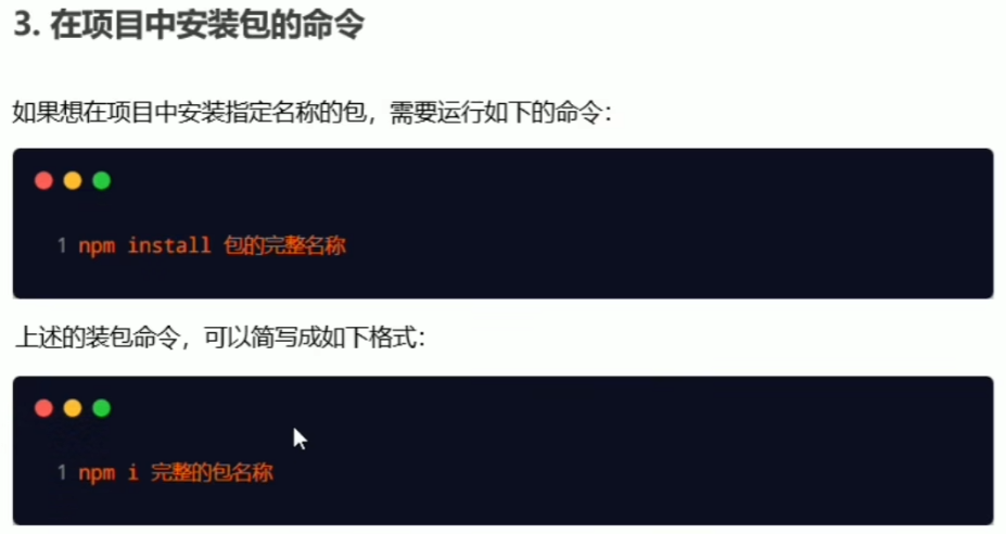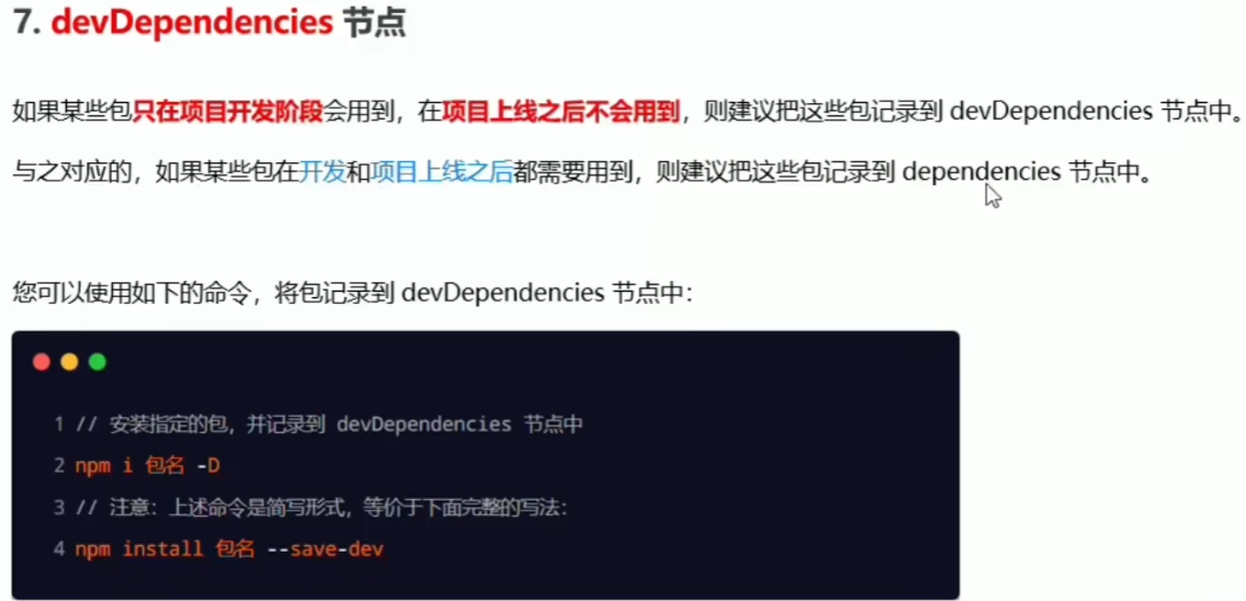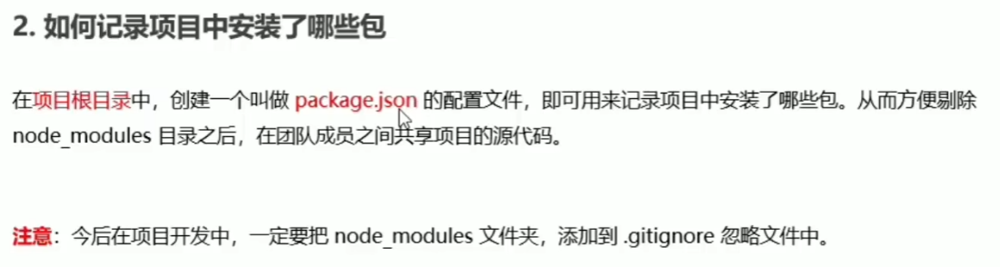 1.下载包:被安装到项目的node_modules目录的包分为:① 项目依赖包(在devdependencies节点的包,只在开发使用:npm i 包名)② 核心依赖包(记录到dependencies节点的包,在开发和项目上线时都会使用:npm i 包名 -D)