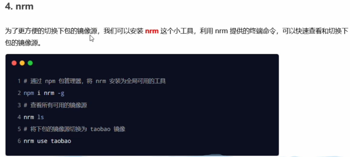 nrm ls:获取所有镜像源。nrm use 镜像名:切换镜像