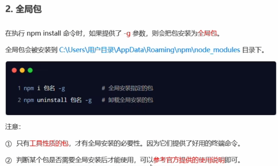 2.全局包:执行npm -i时提供-g安装的包,只有工具性质的包才需要进行全局安装。