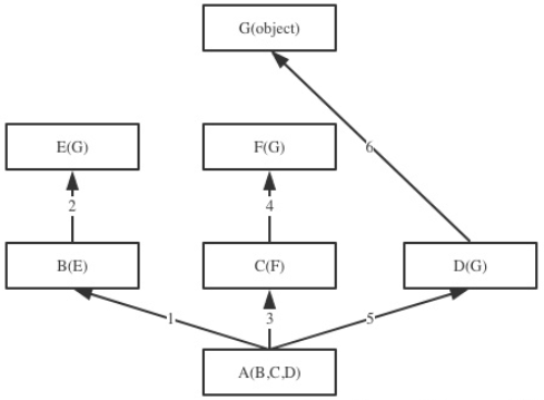 [<class '__main__.A'>, <class '__main__.B'>, <class '__main__.E'>, <class '__main__.C'>, <class '__main__.F'>, <class '__main__.D'>, <class '__main__.G'>, <class 'object'>]