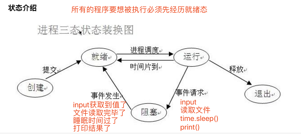 """描述的程序的运行状态""" 阻塞:阻塞态 非阻塞:就绪态、运行态 理想状态:我们应该让我们的写的代码永远处于就绪态和运行态之间切换