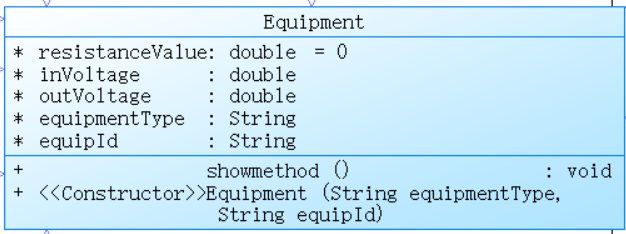 double resistanceValue:用于表示设备的电阻值,初始化为 0,不同的具体设备子类有不同的电阻值设定。double inVoltage:记录设备的输入电压,在电路中随着电流流经不同设备以及开关等状态变化。double outVoltage:设备的输出电压,会根据设备的具体功能和当前输入电压以及自身状态来确定其具体数值。String equipmentType:标识设备的类型。String equipId:设备的唯一标识符。
