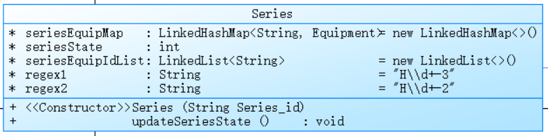 LinkedHashMap <String,Equipment> seriesEquipMap:以设备标识为键,对应的Equipment类型设备对象为值的映射,用于存储串联电路中包含的各个设备。int seriesState:表示串联电路的整体状态,初始化为 0,通过updateSeriesState方法根据串联电路中各个设备的状态来更新这个值,若为 1 则表示串联电路处于导通状态。LinkedList <String> seriesEquipIdList:存储串联电路中包含的各个设备的标识。String regex1和String regex2:定义了两个正则表达式字符串,用于匹配互斥开关(mutex_switch)中特定引脚相关的设备标识情况,辅助判断互斥开关对串联电路状态的影响。