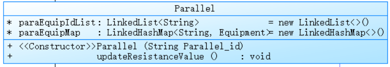 LinkedList<String> paraEquipIdList:存储并联电路中所包含的各个设备的标识。LinkedHashMap<String,Equipment> paraEquipMap:以设备标识为键,对应的Equipment类型设备对象为值的映射,和串联电路中的类似映射作用相似。