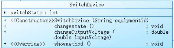 public SwitchDevice(String equipmentid):构造函数,调用父类构造函数传入"K"(表示开关类型)和给定的设备标识equipmentid来初始化对象,同时初始化switchState和resistanceValue。public void changestate():用于改变开关的状态,通过简单的逻辑将当前状态取反(switchState = (oldState == 0)? 1 : 0;),实现开关的开合切换操作。public double changeOutputVoltage(double inputVoltage):根据开关当前的状态来确定输出电压。@Override public void showmethod():重写了父类的showmethod方法,按照规定格式输出开关设备的状态信息。