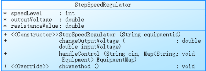 public StepSpeedRegulator(String equipmentid):构造函数,调用父类构造函数传入"F"(表示分档调速器类型)和给定的设备标识equipmentid来初始化对象,同时初始化speedLevel和resistanceValue这两个属性。public double changeOutputVoltage(double inputVoltage):根据当前的调速档位speedLevel来计算并返回输出电压。不同的档位对应不同的与输入电压的比例关系。public void handleControl(String cin, Map<String, Equipment> EquipmentMap):用于处理接收到的控制命令字符串,通过解析字符串中的关键信息,在设备映射EquipmentMap中查找对应的调速器对象,实现对调速器的外部控制逻辑。@Override public void showmethod():重写父类的showmethod方法,按照规定格式输出调速器的当前档位信息。