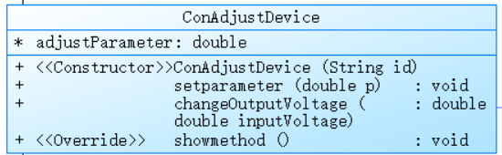 public ConAdjustDevice(String id):构造函数,调用父类构造函数传入"L"(表示连续调速器类型)和给定的设备标识id来初始化对象,同时初始化adjustParameter和resistanceValue(电阻值设为 0)属性。public void setparameter(double p):用于设置连续调速器的调节参数值,直接将传入的参数值赋给adjustParameter属性,以便后续根据该参数计算输出电压等操作。public double changeOutputVoltage(double inputVoltage):根据当前的调节参数adjustParameter来计算并返回输出电压。@Override public void showmethod():重写父类的showmethod方法,按照规定格式输出连续调速器的调节参数信息。