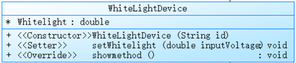 public WhiteLightDevice(String id):构造函数,调用父类构造函数传入"B"(表示白炽灯类型)和给定的设备标识id来初始化对象,同时初始化Whitelight属性并设置电阻值为 10(代表白炽灯的一个固有电阻特性设定)。public void setWhitelight(double inputVoltage):按照不同的输入电压区间来计算并设置白炽灯的亮度值。@Override public void showmethod():重写父类的showmethod方法,按照规定格式输出白炽灯的亮度值。