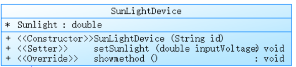 changestate1(Equipment e):重写父类方法,返回true,表明在电路状态判断中该设备默认处于有效可调节状态。changeopenness(double light):根据输入电压(通过inv属性体现)以及给定的光照强度light值按照不同的条件区间来设置设备的开合程度。