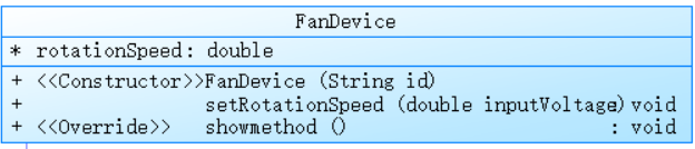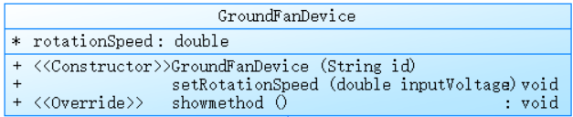 changestate1(Equipment e):重写父类方法,返回true,意味着在电路状态考量中该设备默认处于有效运行状态。setrotate(double inv):按照多个不同的电压区间来分别设置风扇的旋转速度,实现了基于不同电压范围对应不同挡位转速的逻辑。