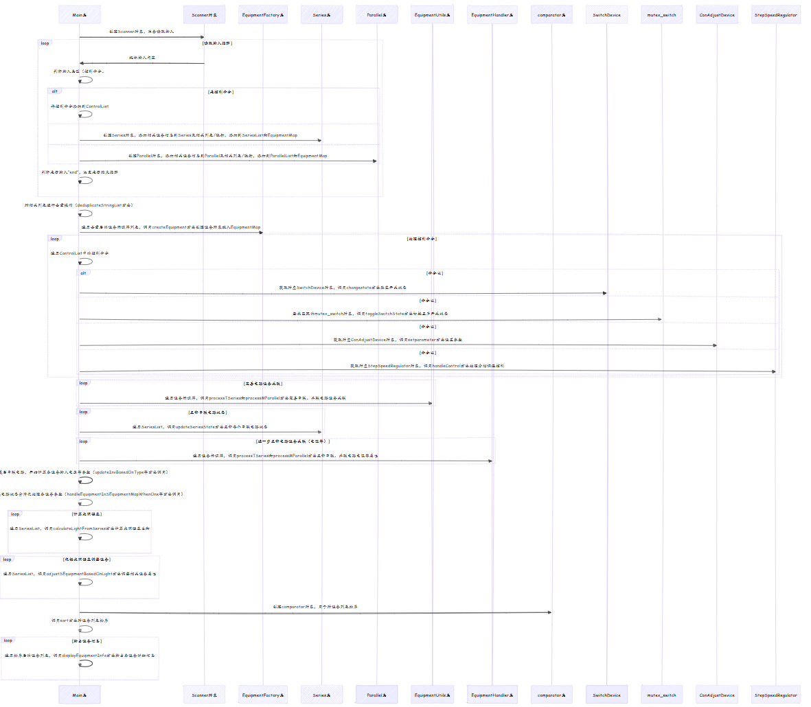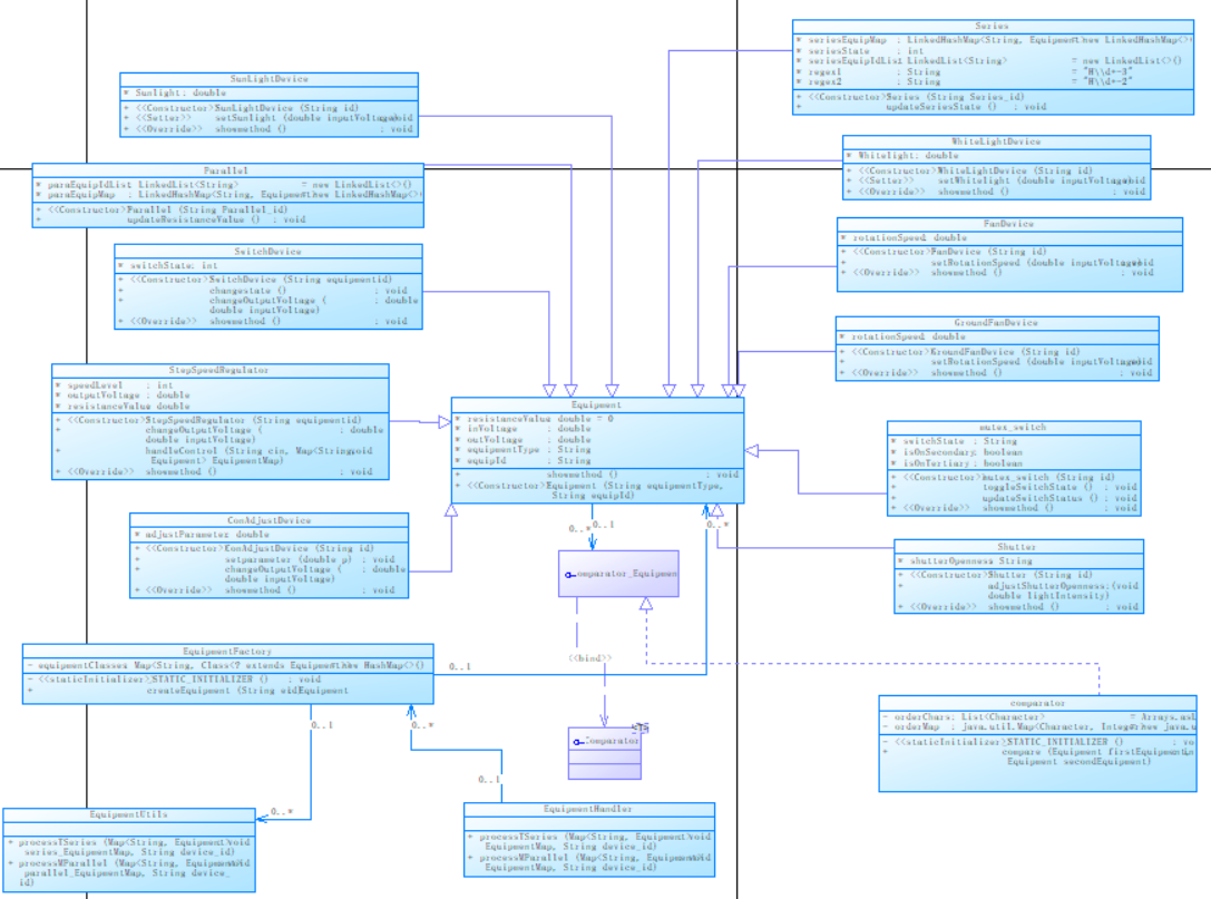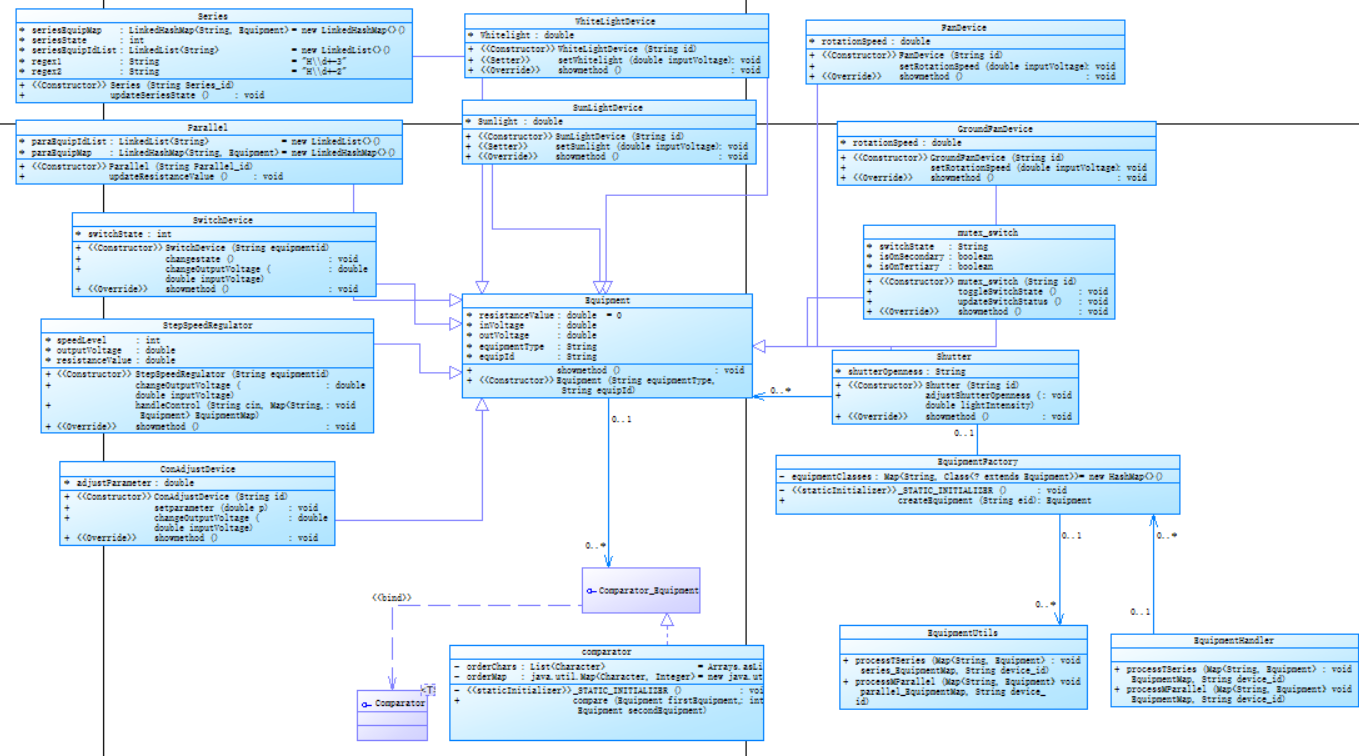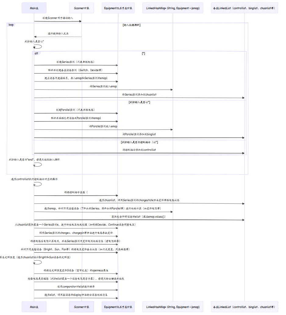 这段代码实现了一个电路模拟系统,能够对包含多种不同类型设备组成的串联、并联电路进行配置、控制以及展示电路状态等操作。整体架构上通过不同的类来表示各种设备、电路结构,同时有工具类辅助处理电路中设备间的关联构建、状态更新以及结果输出等逻辑。