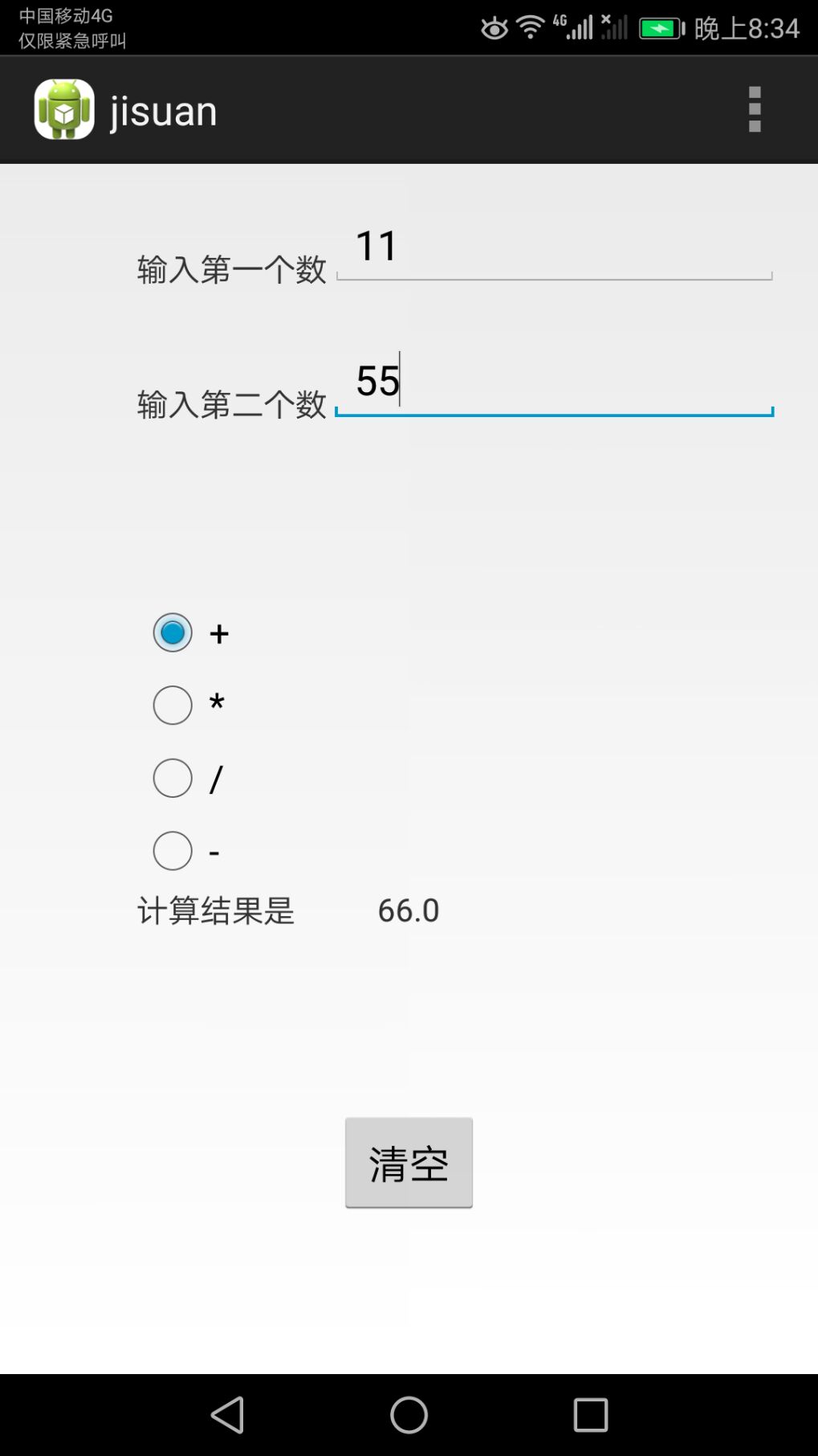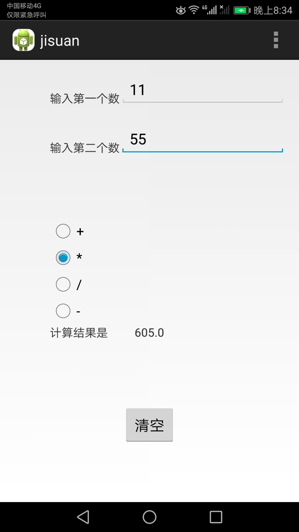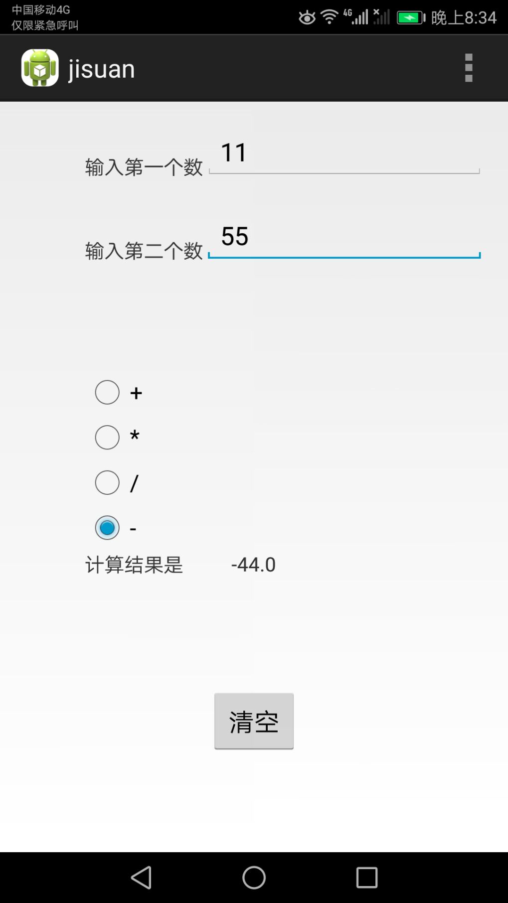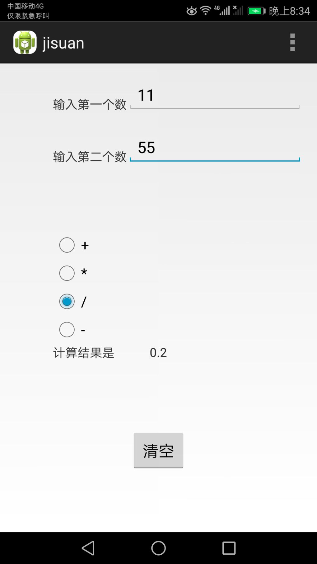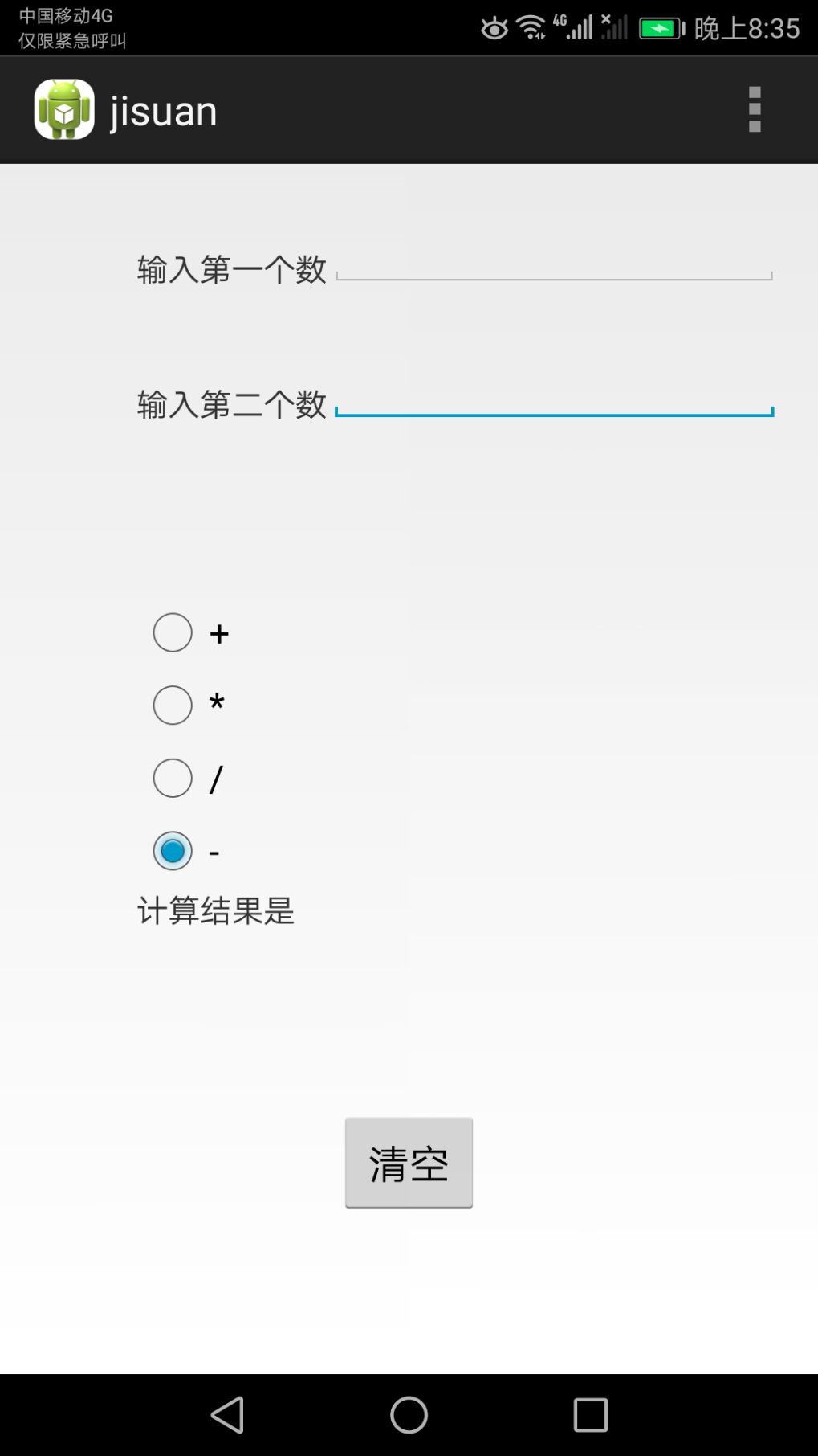 <RelativeLayout xmlns:android="http://schemas.android.com/apk/res/android" xmlns:tools="http://schemas.android.com/tools" android:layout_width="match_parent" android:layout_height="match_parent" android:paddingBottom="@dimen/activity_vertical_margin" android:paddingLeft="@dimen/activity_horizontal_margin" android:paddingRight="@dimen/activity_horizontal_margin" android:paddingTop="@dimen/activity_vertical_margin" tools:context=".MainActivity" > <EditText android:id="@+id/EditText01" android:layout_width="200dp" android:layout_height="wrap_content" android:layout_alignParentRight="true" android:layout_below="@+id/editText2" android:layout_marginTop="20dp" android:ems="10" /> <TextView android:id="@+id/TextView01" android:layout_width="wrap_content" android:layout_height="wrap_content" android:layout_alignBottom="@+id/EditText01" android:layout_toLeftOf="@+id/EditText01" android:text="输入第二个数" /> <EditText android:id="@+id/editText2" android:layout_width="200dp" android:layout_height="wrap_content" android:layout_alignLeft="@+id/EditText01" android:layout_alignParentTop="true" android:ems="10" /> <TextView android:id="@+id/textView1" android:layout_width="wrap_content" android:layout_height="wrap_content" android:layout_alignBottom="@+id/editText2" android:layout_toLeftOf="@+id/editText2" android:text="输入第一个数" /> <TextView android:id="@+id/tv" android:layout_width="wrap_content" android:layout_height="wrap_content" android:layout_alignTop="@+id/textView2" android:layout_centerHorizontal="true" /> <Button android:id="@+id/RE" android:layout_width="wrap_content" android:layout_height="wrap_content" android:layout_alignParentBottom="true" android:layout_centerHorizontal="true" android:layout_marginBottom="53dp" android:onClick="click" android:text="清空" /> <TextView android:id="@+id/textView2" android:layout_width="wrap_content" android:layout_height="wrap_content" android:layout_above="@+id/RE" android:layout_alignLeft="@+id/TextView01" android:layout_marginBottom="78dp" android:text="计算结果是" /> <RadioGroup android:id="@+id/rdg" android:layout_width="wrap_content" android:layout_height="wrap_content" android:layout_above="@+id/textView2" android:layout_alignLeft="@+id/textView2" android:orientation="vertical" > <RadioButton android:id="@+id/add" android:layout_width="wrap_content" android:layout_height="wrap_content" android:layout_toRightOf="@+id/rdg" android:text="+" /> <RadioButton android:id="@+id/mul" android:layout_width="wrap_content" android:layout_height="wrap_content" android:layout_toRightOf="@+id/minus" android:text="*" /> <RadioButton android:id="@+id/devide" android:layout_width="wrap_content" android:layout_height="wrap_content" android:layout_toRightOf="@+id/mul" android:text="/" /> <RadioButton android:id="@+id/minus" android:layout_width="wrap_content" android:layout_height="wrap_content" android:layout_toRightOf="@+id/add" android:text="-" /> </RadioGroup> </RelativeLayout>