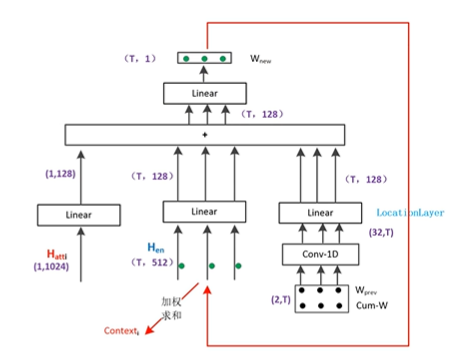 Decoder:两个RNN(attention rnn和decoder rnn),线性映射层;Attention部分: