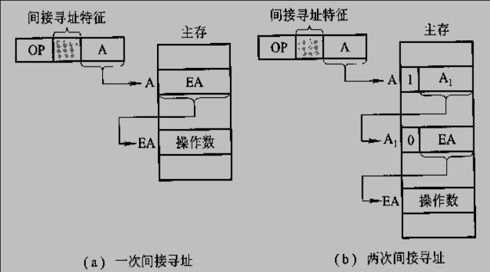 单元地址,也就是说,有效地址是由形式地址间接提供的,即为间接寻址,即EA=(A);优点是扩大操作数寻址范围,便于编制程序(子程序返回)