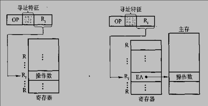 5.寄存器寻址:地址码字段直接指出了寄存器的编号,即EA=R;其操作数在由R所指的寄存器内。由于操作数不在主存中,故寄存器寻址在指令执行阶段无须访存,减少了执行时间。由于地址字段只需指明寄存器编号(计算机中寄存器数有限),故指令字较短,节省了存储空间,因此寄存器寻址在计算机中得到广泛应用。