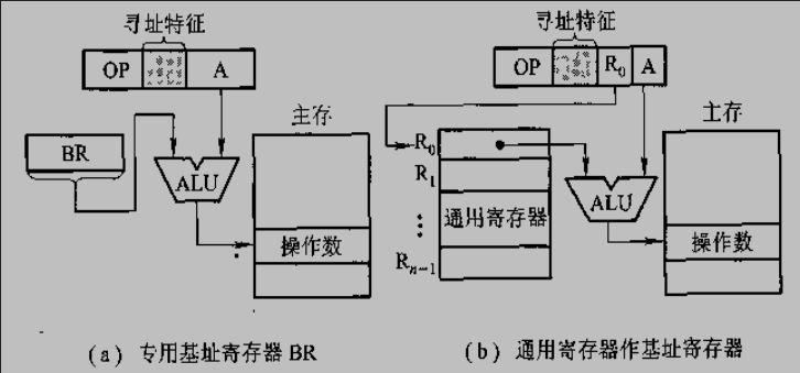 基址寻可以扩大操作数的寻址范围,因基址寄存器的位数可以大于形式地址A的位数。将主存空间分为若干段,每段首地址存于基址寄存器中,段内的位移量由指令字中形式地址A指出,这样操作数的有效地址就等于基址寄存器内容与段内位移量之和,只要对基址寄存器的内容作修改,便可访问主存的任一单元。