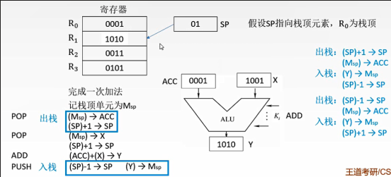 堆栈的运行方式为先进后出或先进先出两种,先进后型堆栈的操作数只能从一个口进行读或写。以软堆栈为例,可用堆栈指针SP指出栈顶地址,也可用CPU中一个或两个寄存器作为SP。操作数只能从栈顶地址指示的存储单元存或取
