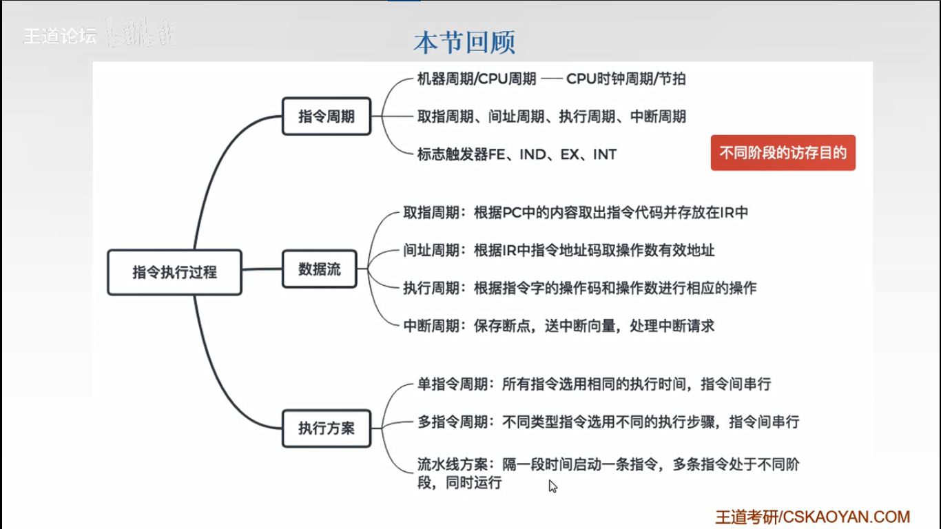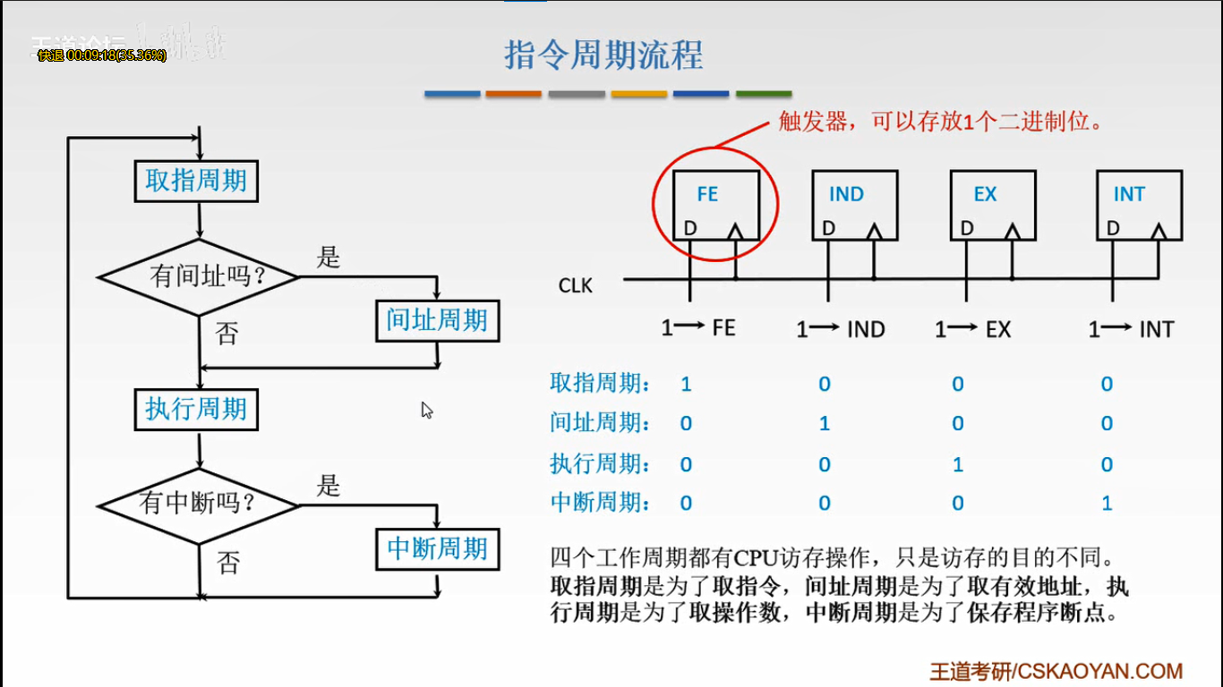 四个工作周期都有CPU访存操作,只是访存的目的不同。取指周期是为了取指令,间址周期是为了取有效地址,执行周期是为了取操作数,中断周期是为了保存程序断点。