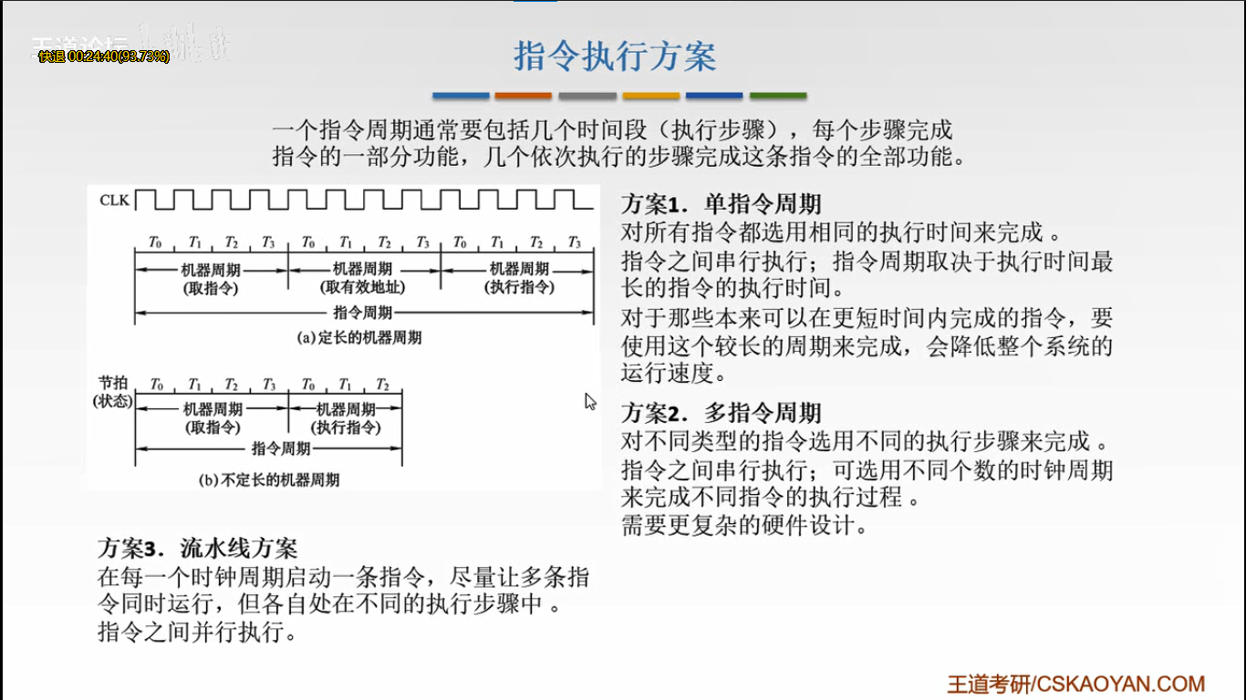 对所有指令都选用相同的执行时间来完成。指令之间串行执行;指令周期取决于执行时间最长的指令的执行时间。对于那些本来可以在史短时间内完成的指令,要使用这个较长的周期来完成,会降低整个系统的运行速度。
