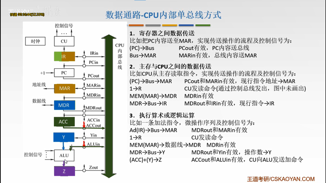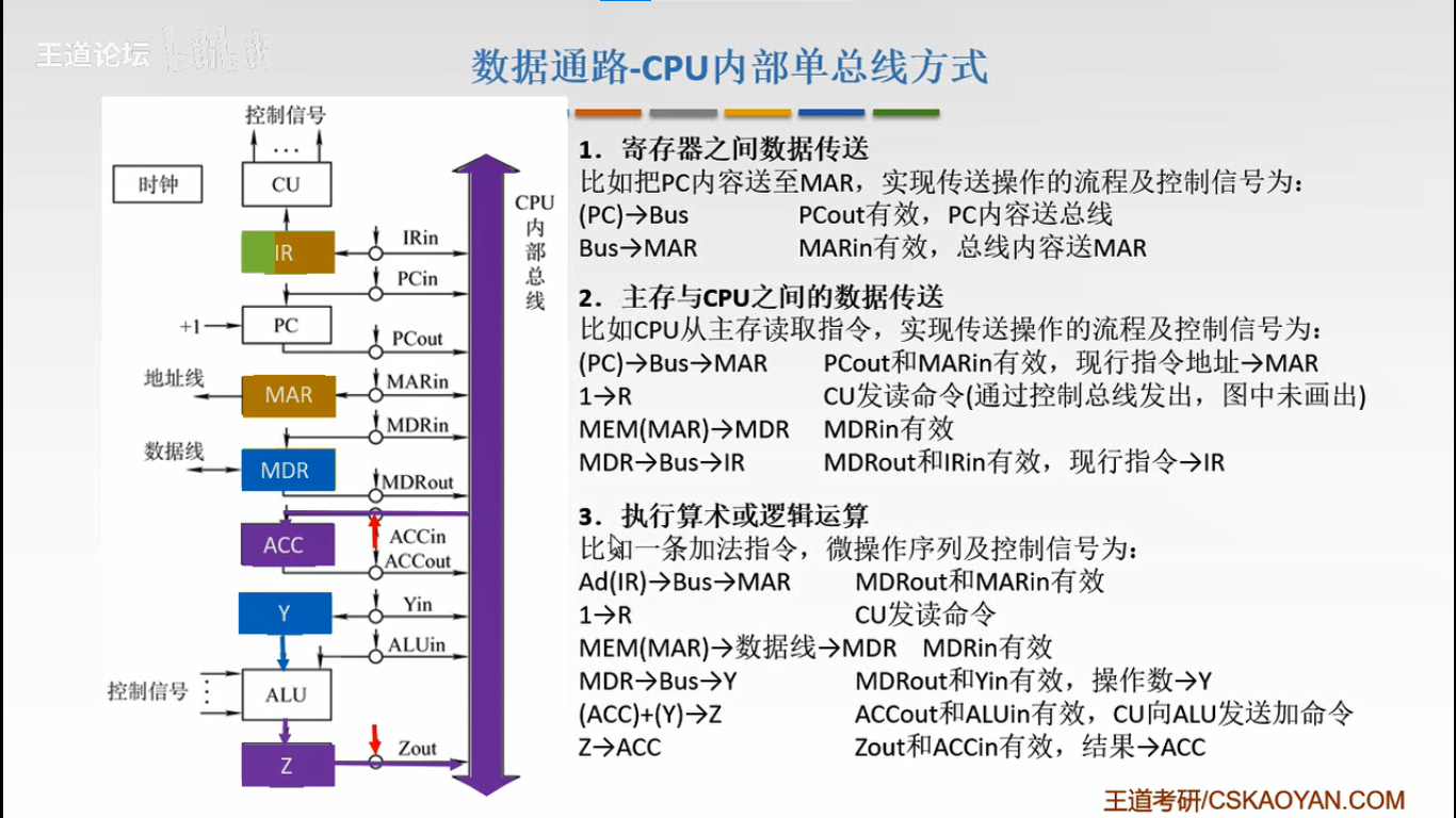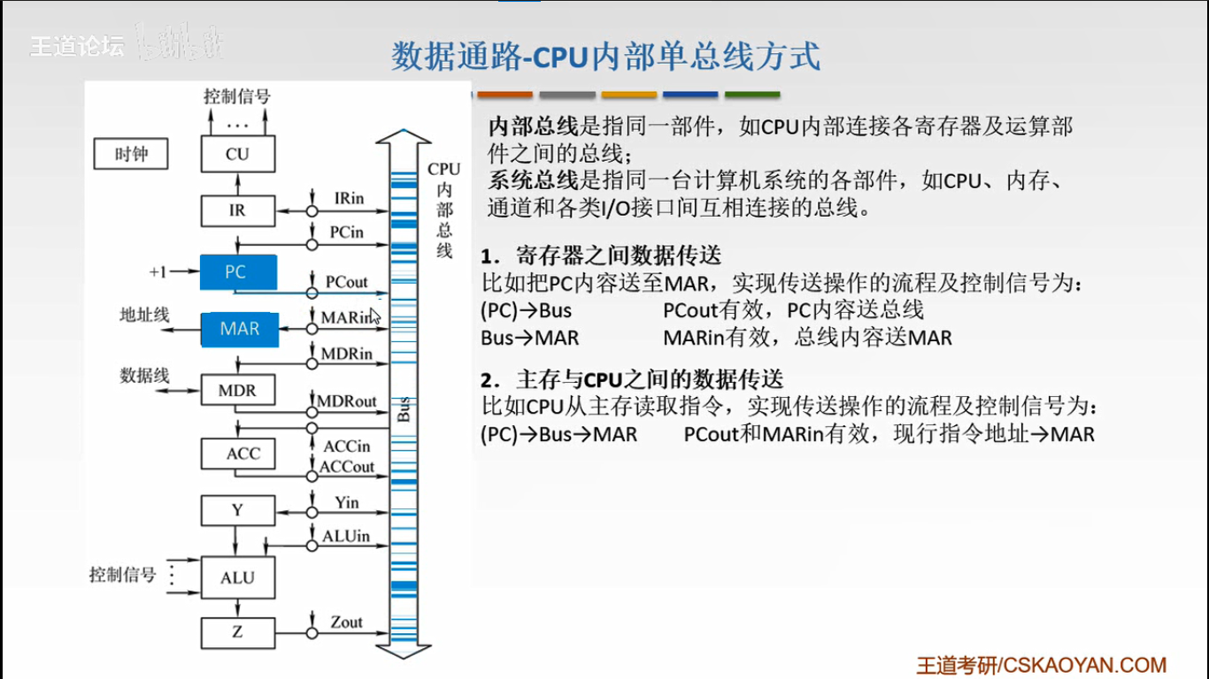 单总线方式:CPU中各部件连接到一条总线上,通过连接线的OUT/IN的有效状态,发送/接收数据