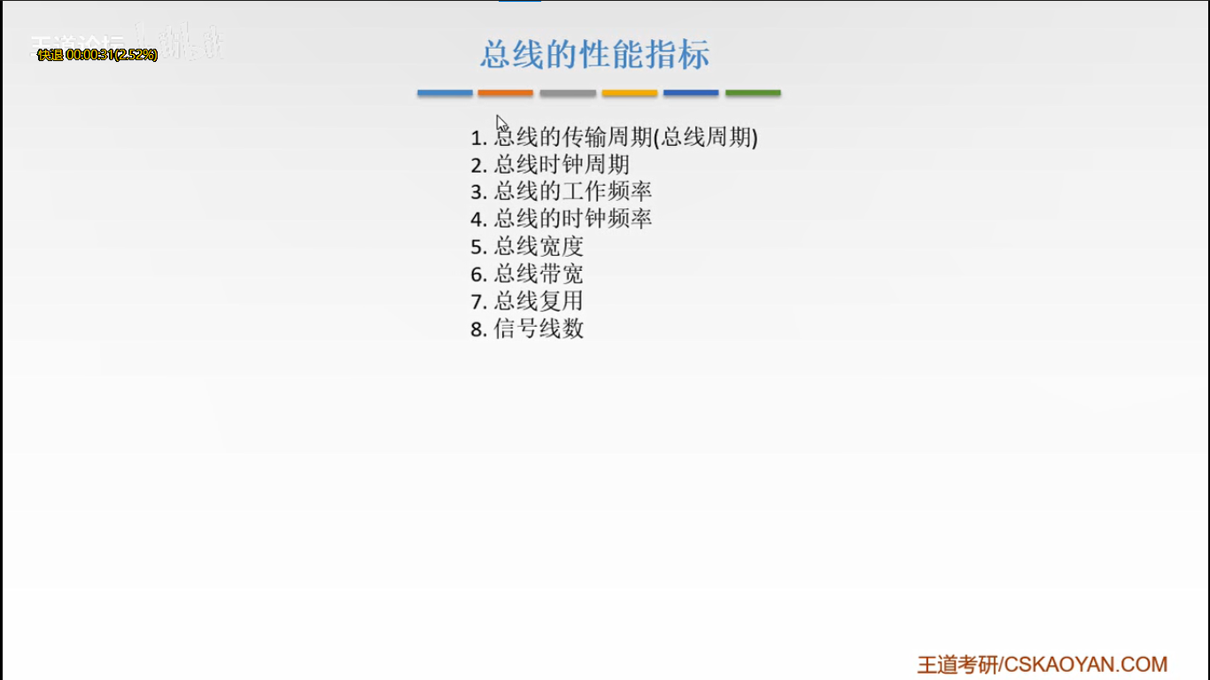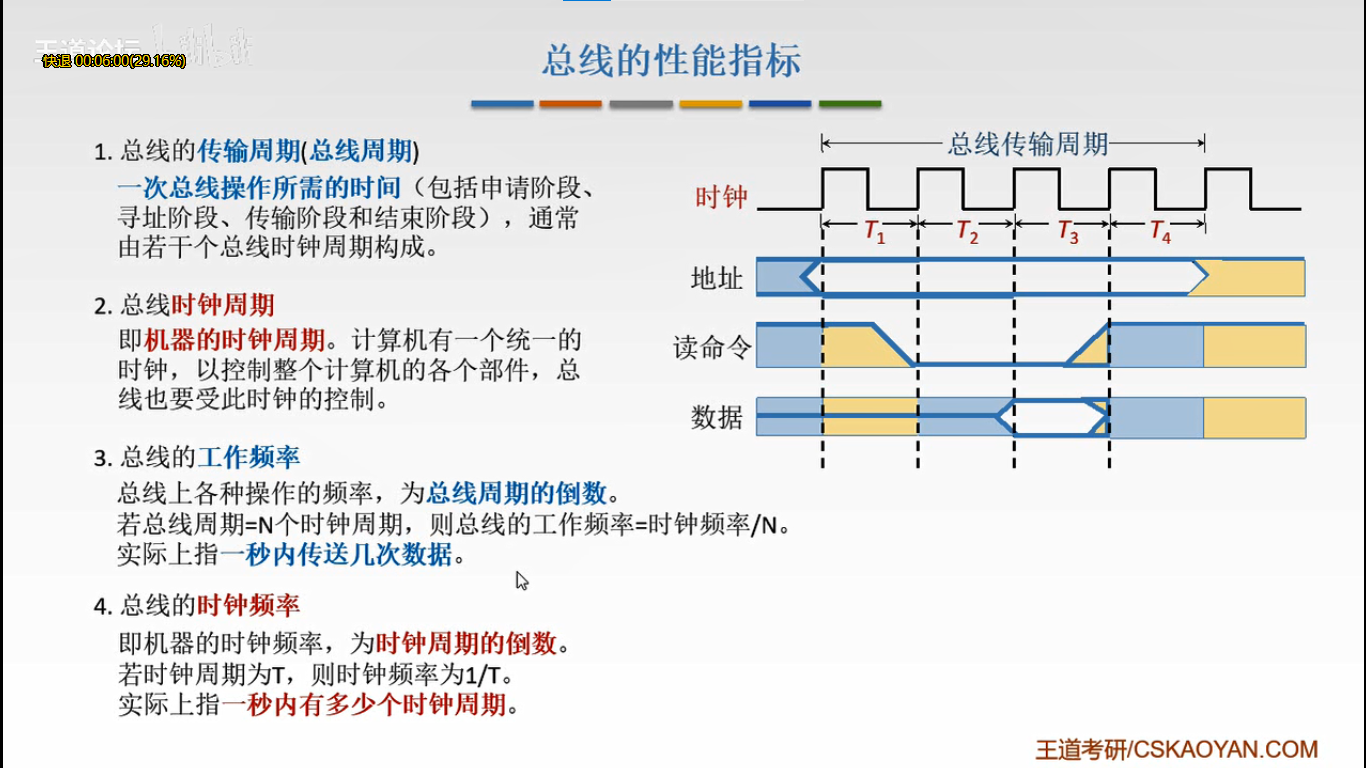 一次总线操作所需的时间(包括申请阶段、寻址阶段、传输阶段和结束阶段),通常由若干个总线时钟周期构成。