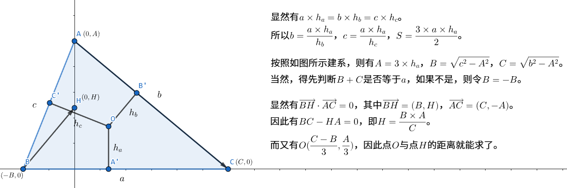 已知一三角形的一条边长 \(a\) 和 该三角形重心到 \(a\)、\(b\)、\(c\) 三条边的距离 \(h_a\)、\(h_b\)、\(h_c\),求三角形的面积 \(S\) 和其重心与垂心的距离 \(d\)。