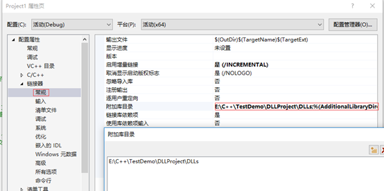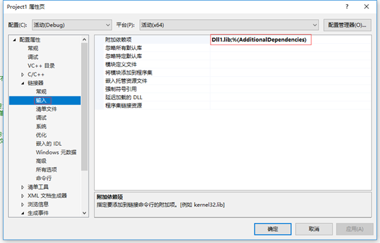 2.2 在链接器,输入里的附加依赖项里添加Dll1.lib