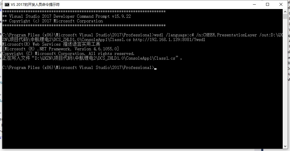 如上图所示,输入命令“wsdl /language:c# /n:CHEER.PresentationLayer /out:生成类的物理路径(需先创建cs文件) WebService接口URL或wsdl文件物理路径”即可。