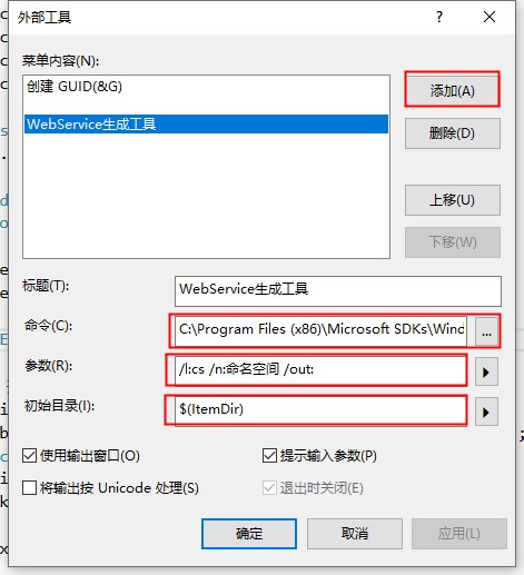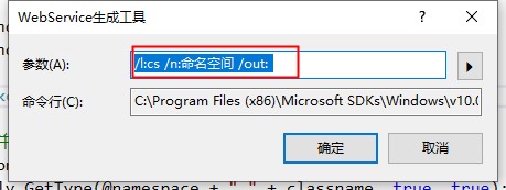 输入上图红框中的各个参数,其中,命令是:C:\Program Files (x86)\Microsoft SDKs\Windows\v10.0A\bin\NETFX 4.6.1 Tools\wsdl.exe,即wsdl.exe的物理路径。