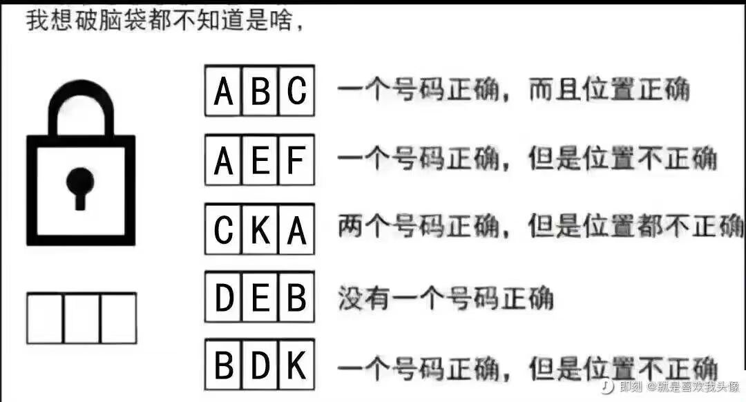 ①一二条能确定一定不含A,可能的字母有BCEF②看第三条,根据第一条结果,不含A,那正确的肯定有CK,然后再回过头看第一条,能确定第三个是C③再看第三条,CK位置都不对,且已确定第三个是C,K现在在第二个位置且是不多的,那K就只能是第一个,那就是K_C④再看第二条,EF有一个是对的,但是位置都不对,那第二个只能是F