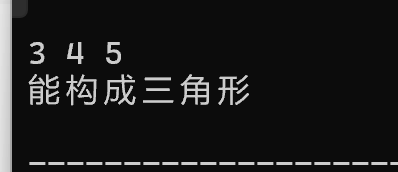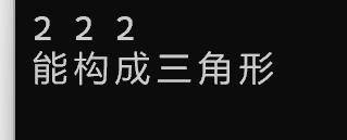 #include <stdio.h> int main() { double a, b, c; scanf("%lf%lf%lf",&a,&b,&c); if (a+b>c&&a+c>b&&b+c>a&&fabs(a-c)<b&&fabs(a-b)<c&&fabs(b-c)<a) printf("能构成三角形\n"); else printf("不能构成三角形\n"); return 0; }