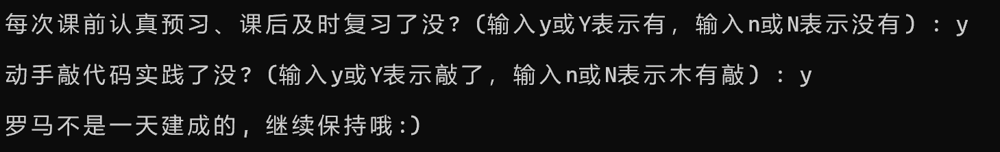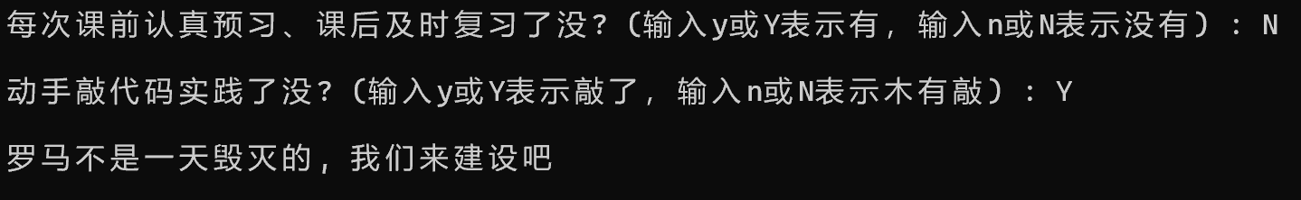 #include <stdio.h> int main() { char ans1, ans2; printf("每次课前认真预习、课后及时复习了没? (输入y或Y表示有,输入n或N表示没有) : "); ans1 = getchar(); getchar();// printf("\n动手敲代码实践了没? (输入y或Y表示敲了,输入n或N表示木有敲) : "); ans2 = getchar(); if ((ans1=='y'||ans1=='Y')&&(ans2=='y'||ans2=='Y')) printf("\n罗马不是一天建成的, 继续保持哦:)\n"); else printf("\n罗马不是一天毁灭的, 我们来建设吧\n"); return 0; }