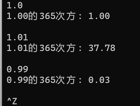 #include <stdio.h> #include <math.h> int main() { double x,ans; while(scanf("%lf", &x) != EOF) { ans = pow(x, 365); printf("%.2f的365次方: %.2f\n", x, ans); printf("\n"); } return 0; }