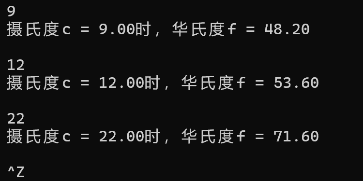 #include <stdio.h> #include <math.h> int main() { double f, c; while(scanf("%lf",&c) != EOF) { f = (9*c/5+32); printf("摄氏度c = %.2f时,华氏度f = %.2f\n",c,f); printf("\n"); } return 0; }